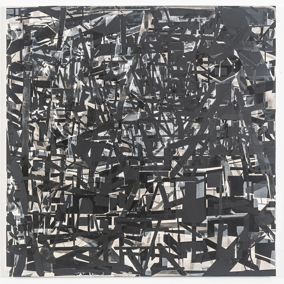 Nathan explores relationships between the landscape, architecture and aesthetics. Stenciling black acrylic paint onto raw canvas in flat, geometric cross sections, layers accumulate into dense silhouette-scapes of passageways, obstructions and fluctuating figure/ground relationships.